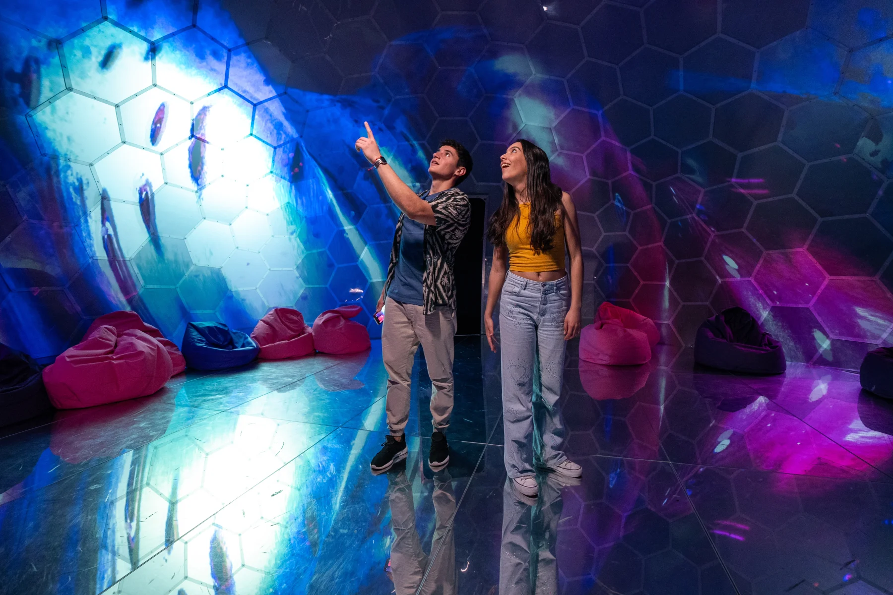 Stap binnen in een gloeiende oceaan van lichtjes waar kleuren overal om je heen rimpelen en schijnen. Het is alsof je door pure magie zwemt.